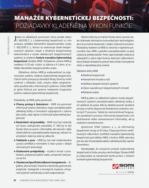 Aj tento rok sme sa zapojili odborným článkom do ročenky pod názvom Kybernetická bezpečnosť pre firmy 2023. Táto publikácia pomáha nie len firmám, sa zorientovať v širokej problematike zabezpečenia IT infraštruktúry. Náš príspevok na tému Požiadavky kladené na výkon funkcie manažéra kybernetickej bezpečnosti nájdete na strane 41.